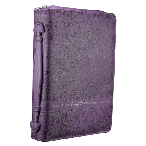 Christian Art GiftsCurrently out of stock, more available soonThis glorious purple Bible cover features a debossed floral design and verse from Philippians 4:13. The Bible cover is constructed of quality man-m...