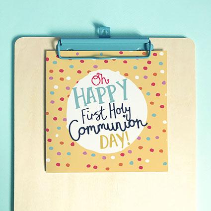 The Wee SparrowWe have 21 in stockA bright, encouraging greeting card with the hand-lettered words 'Oh Happy First Holy Communion Day'. This card is printed inside with the followin...