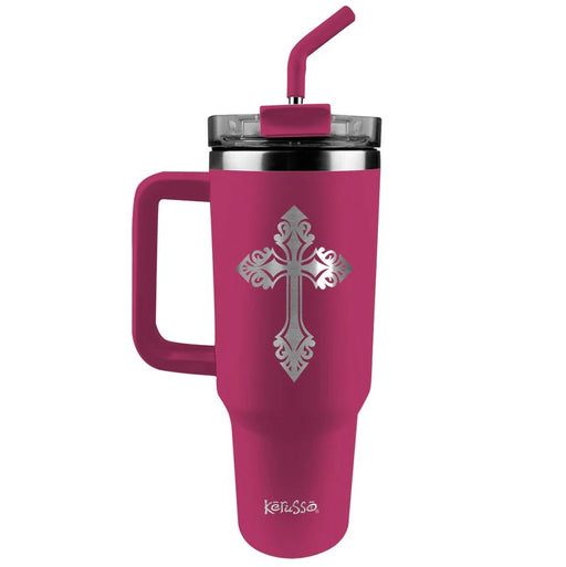 KerussoWe have 2 in stockShare the love of Jesus with this pretty Filigree Cross Stainless-Steel Mug w/Straw by Kerusso in Pink. A practical two-in-one lid allows you to si...