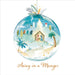 The front of the card features a watercolour nativity design in a Christmas bauble shape with the caption ""Away in a manger.""