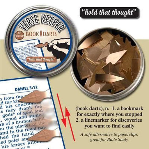 GT LuscombeWe have 5 in stockVerse KeeperBook Darts. Book Darts easily slide up and down the page. No tearing, no stains, no marks, and reusable! Available in tins of all bronz...
