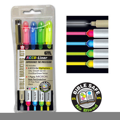 GT LuscombeWe have 4 in stockThis combination kit features 4 ACCU-Gel Bible-Hi-Glider Highlighters and Pigma Micron 01 Fine Point Underliner/Note Pen. No bleed-through. Bible...