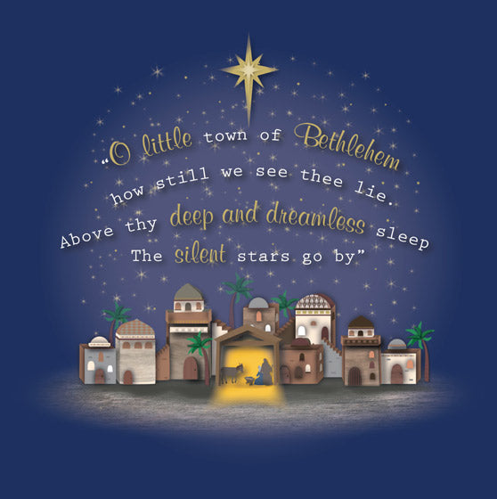 The front of the card features a blue background with a line of Bethlehem buildings and a starry sky. The caption is from a well-known carol: "O little town of Bethlehem, how still we see thee lie. Above thy deep and dreamless sleep the silent stars go by."